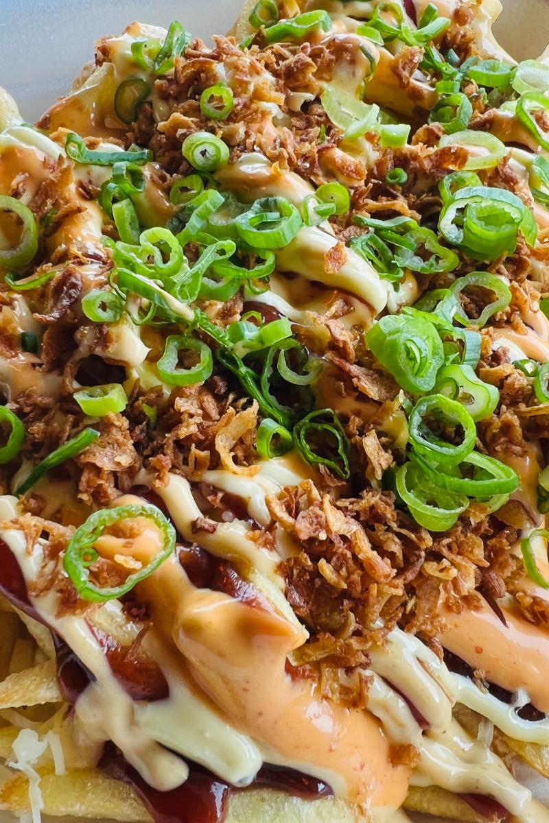 Fries, cheddar saus, hvitløks majones, chili majones, BBQ saus, sprø løk og vårløk