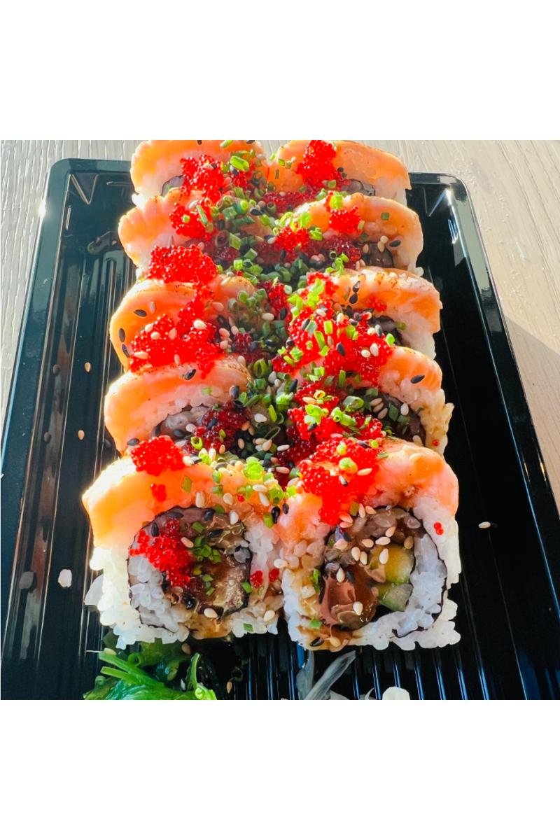 Salmon & avocado inside. Sprinkle sesame, salmon on top, flame, teriyaki, red tobikko.