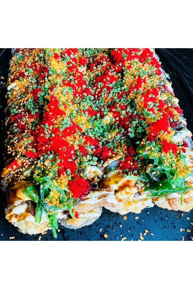 toppet med Teriyaki sauce, chili mayo, Wasabi mayo, pickled ginger, wakame, Spicy rice crisp, tobikko, chives & Kim chee sesame.