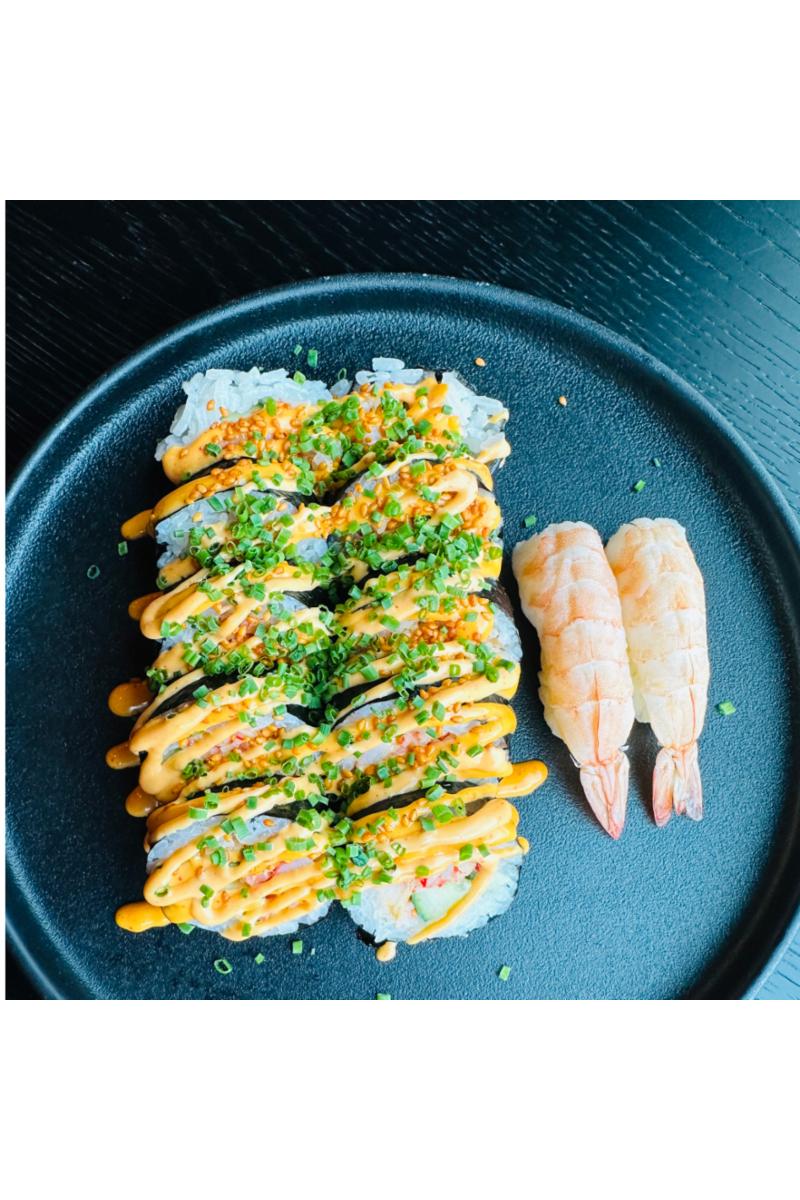 8 biter Spicy Crab maki og 2 nigiri scampi