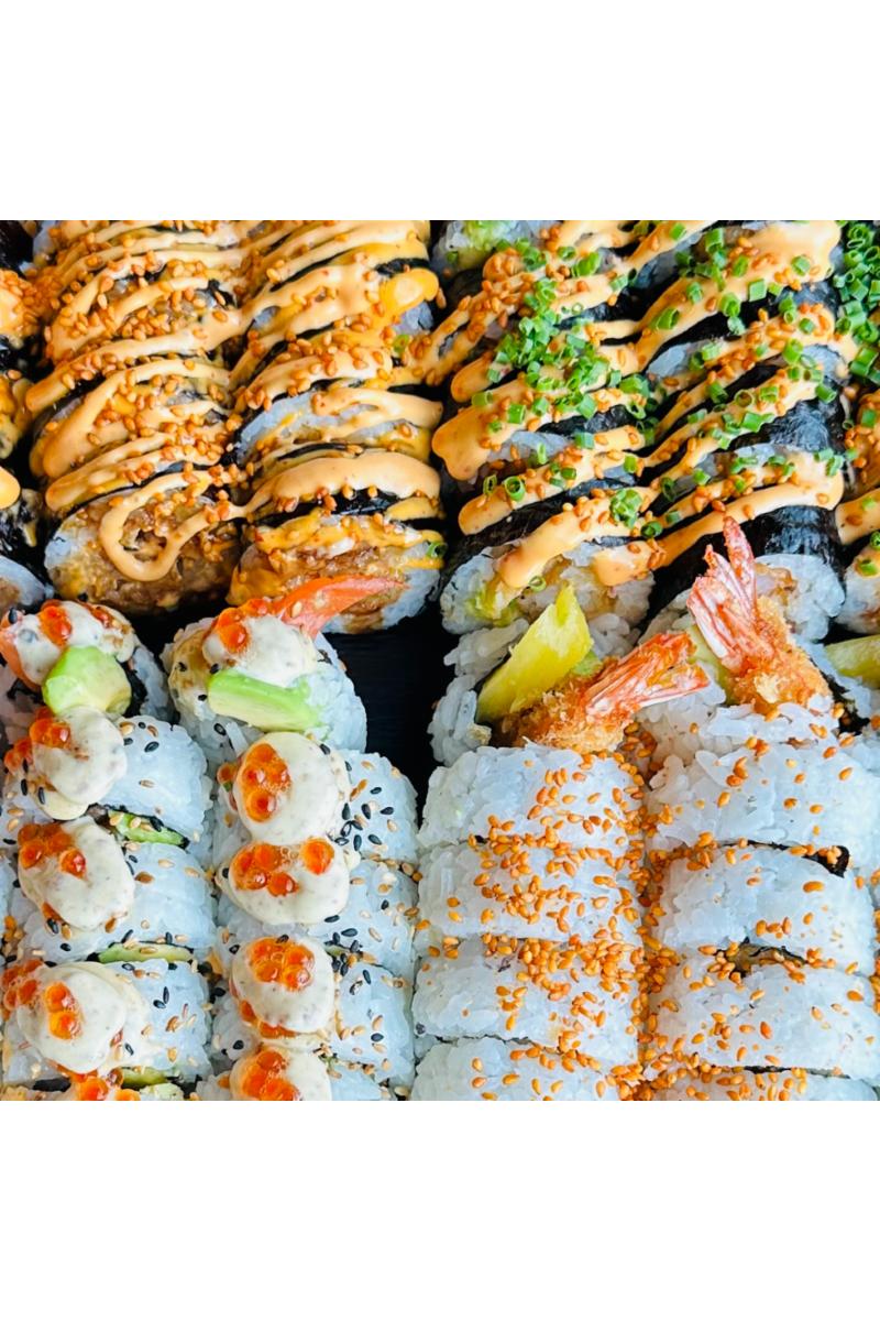 - 8 biter Tempura maki: 2 tempura inside, teriyaki sauce, chilimajo, Kim chee sesame