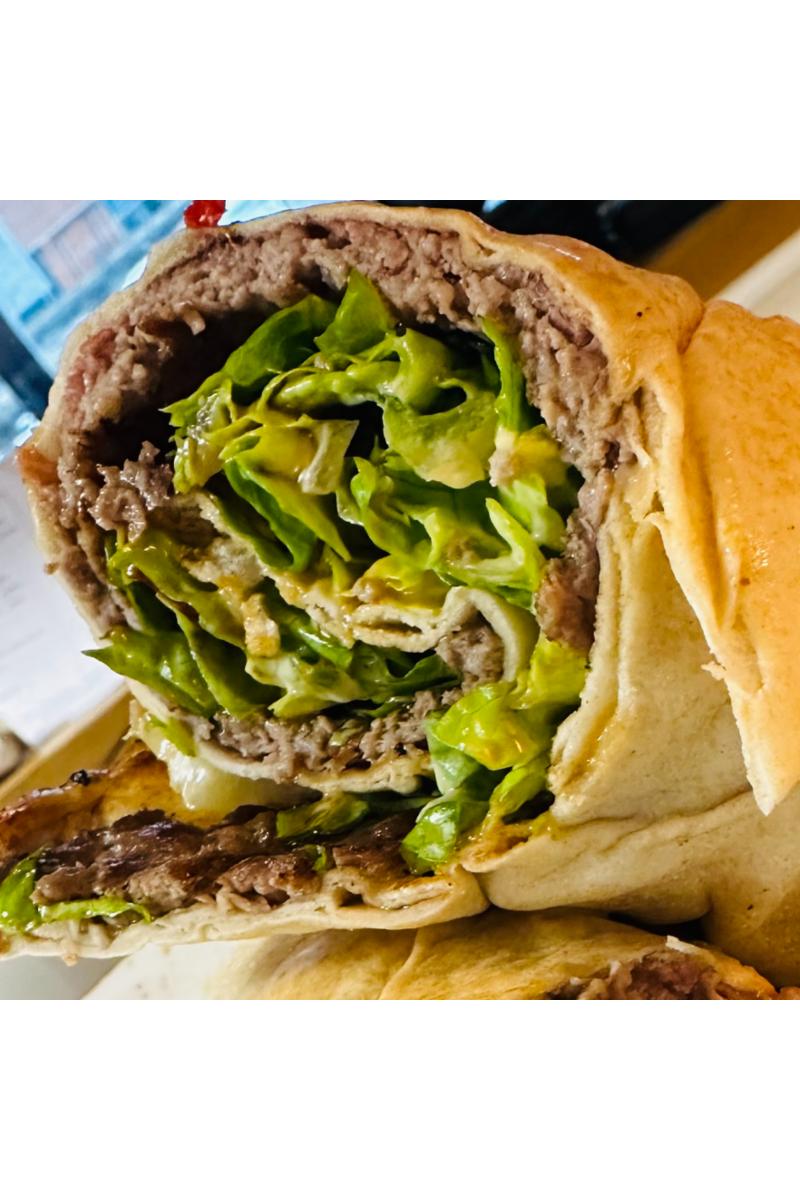 Vi griller babben på kjøttsiden og topper den med Bearnaise og teriyaki saus, salat og vårløk. og ruller den sammen. Kjøtt og kjærlighet i hver eneste bit.